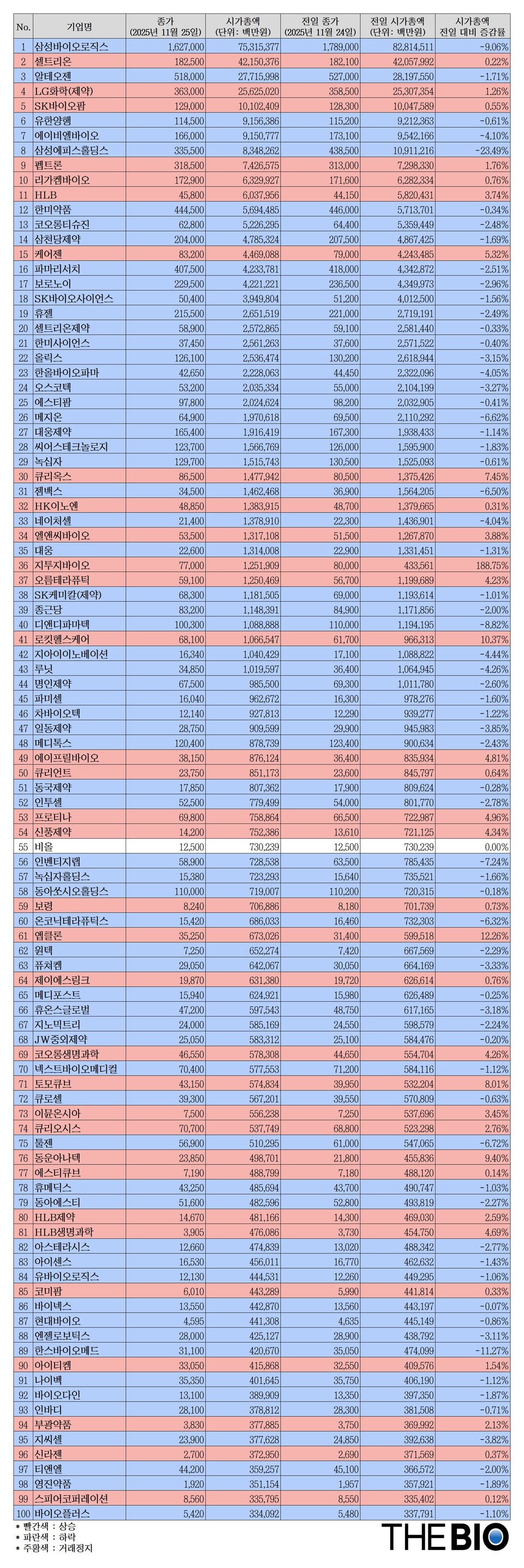[시가총액 모니터] 제약바이오 상장기업 ‘톱 100’(11월 25일)